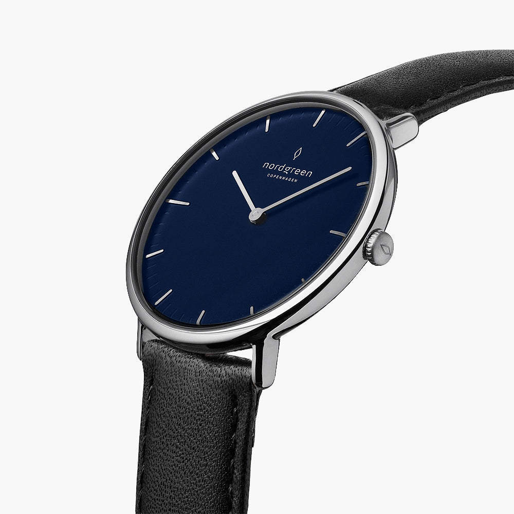 Dette herreur kommer i fire farver, men vi anbefaler at få et ur i sølv med sort urskive og sort rem i enten læder eller vegansk læder for den ekstra seje stil.