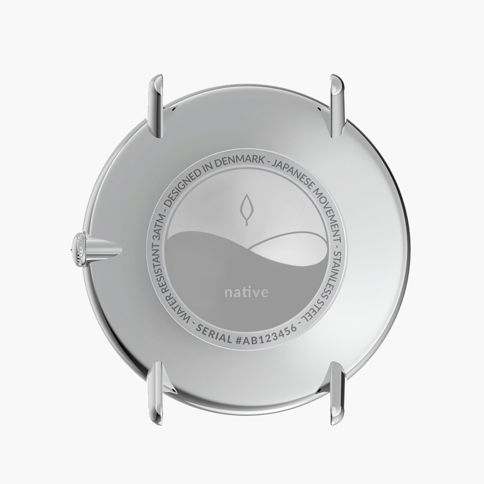 Vores Native herreur er vores mest naturlige design. Uret er til den minimalistiske mand, der værdsætter et herreur med en minimalistisk æstetik. Stål kabinettet på herreuret er afrundet og har robuste, traditionelle knaster, der holder remmen solidt fast. De eneste markeringer på urskiven er timer, hvilket understreger den simple designfilosofi.
